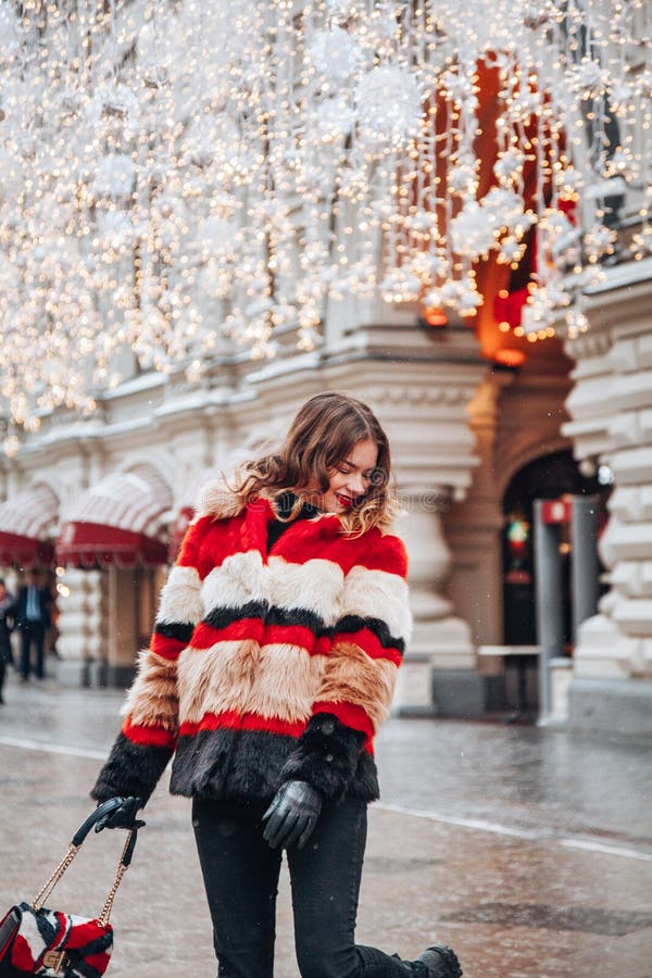 Молодая и прелестная русская девушка представляя перед магазином камеди